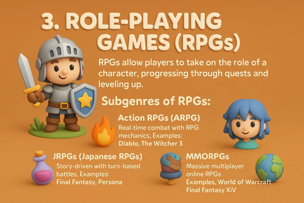 RPGs allow players to take on the role of a character, progressing through quests and leveling up.