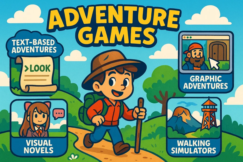 Adventure games emphasize storytelling, exploration, and puzzles rather than combat.