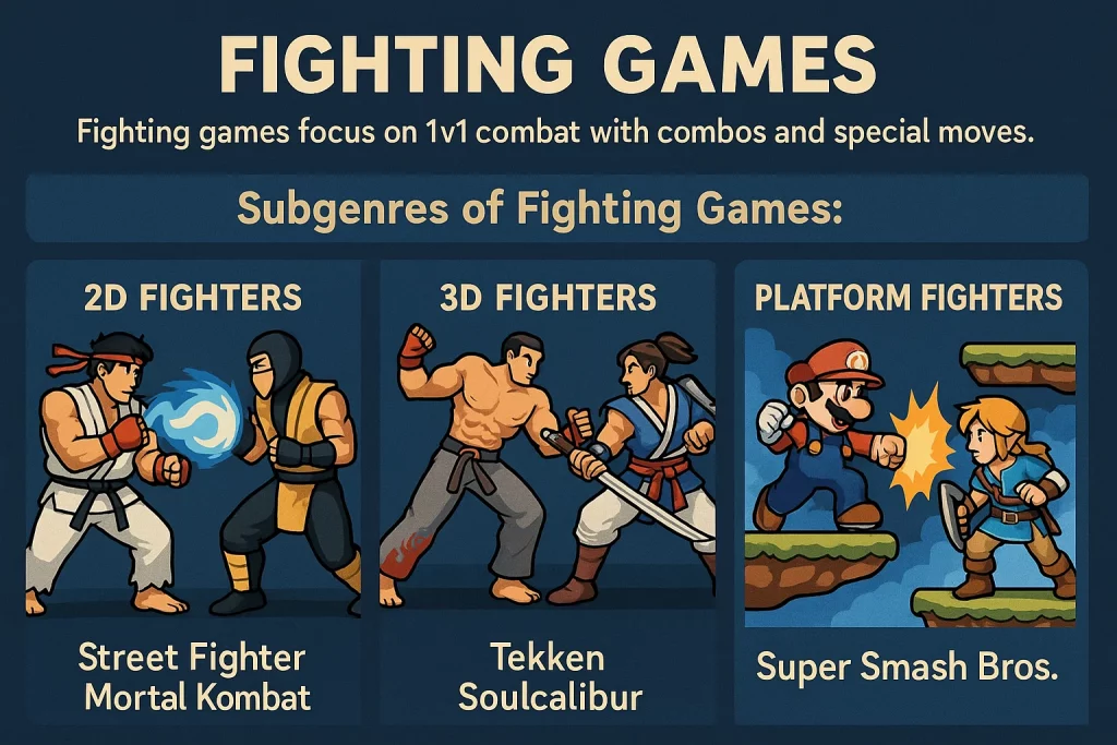 - 2D Fighters: Side-view with combos. Examples: Street Fighter, Mortal Kombat.