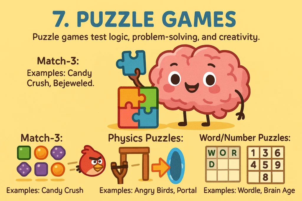 - Word/Number Puzzles: Scrabble, Sudoku-style games. Examples: Wordle, Brain Age.