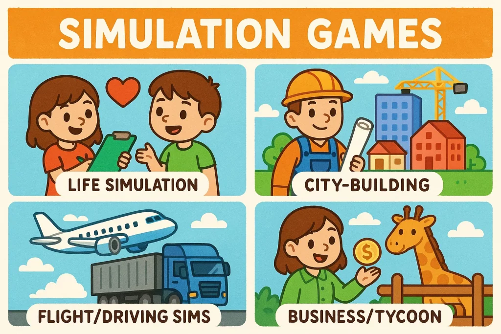 - Flight/Driving Sims: Realistic piloting or driving. Examples: Microsoft Flight Simulator, Euro Truck Simulator.