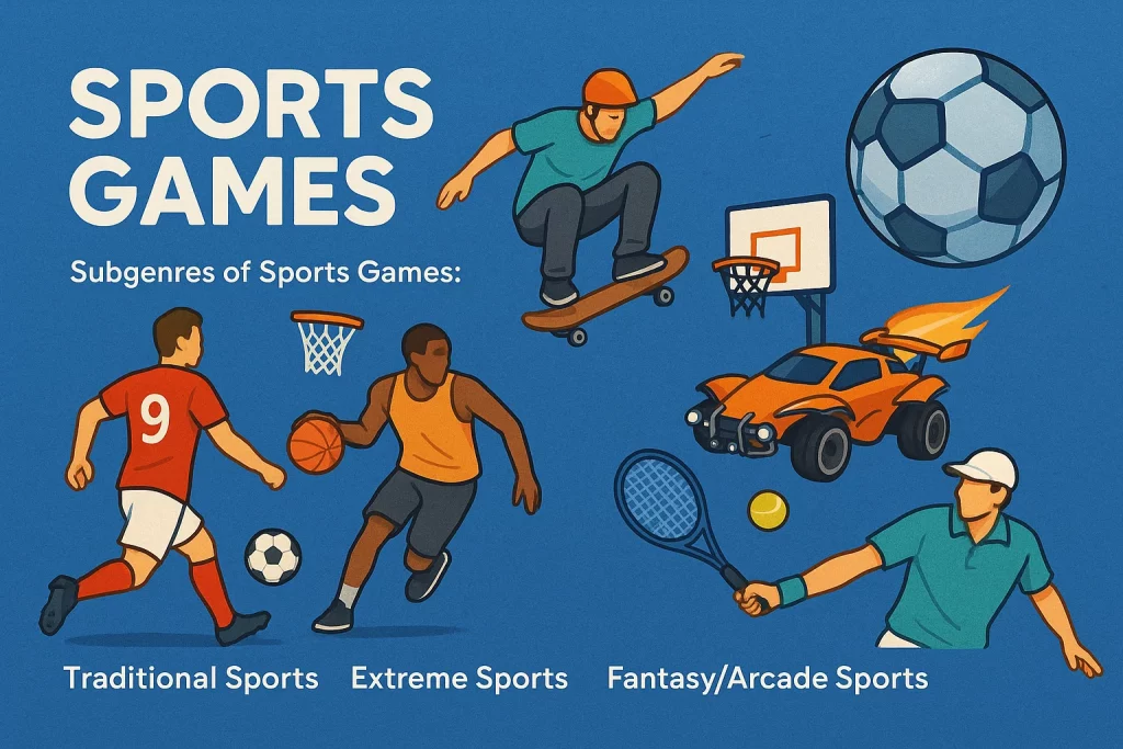 - Fantasy/Arcade Sports: Simplified or fictional sports. Examples: Rocket League, Mario Tennis.