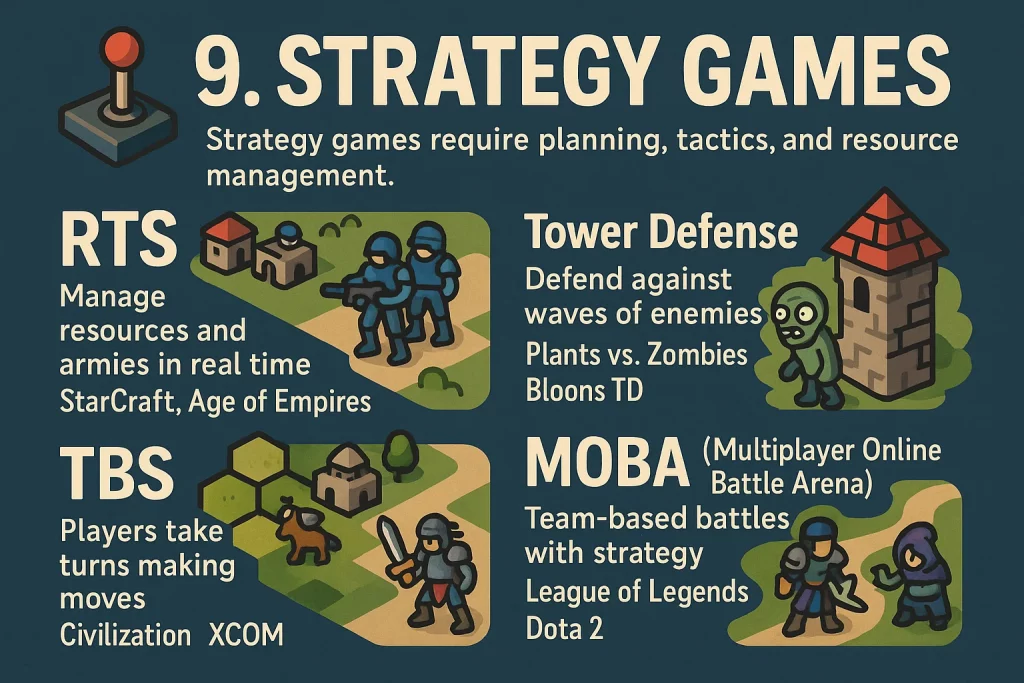 - RTS (Real-Time Strategy): Manage resources and armies in real time. Examples: StarCraft, Age of Empires.