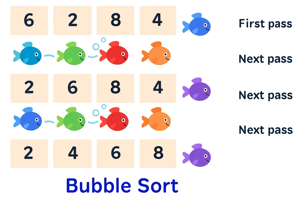 Bubble Sort compares two items at a time—like two friends standing in a line—and swaps them if they’re in the wrong order.